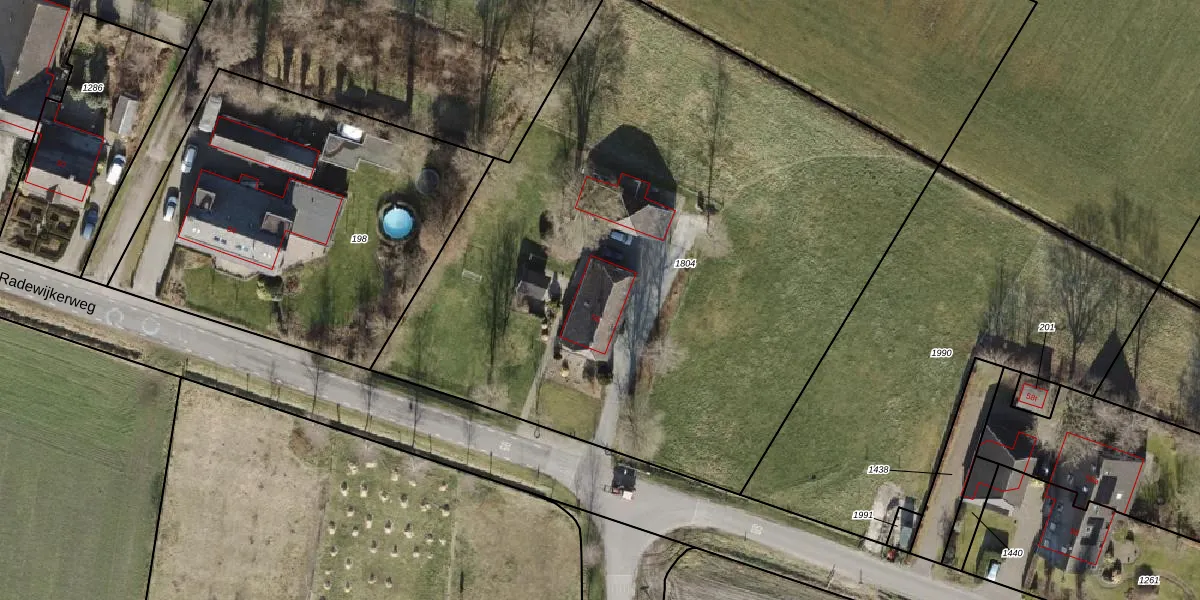 Het perceel waarop Radewijkerweg 56 staat heeft een oppervlakte van 4385 m². Dit is een zeer groot perceel. De perceeloppervlakte wordt geregistreerd door het Kadaster. Gedetailleerde informatie over de maten van dit perceel kunt u vinden in het rapport Kadastrale kaart met maatvoering van Radewijkerweg 56.