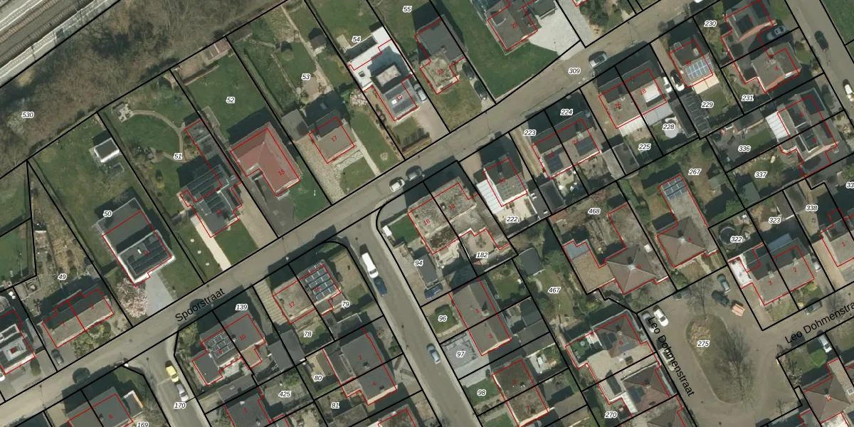 Het perceel waarop Spoorstraat 16 staat heeft een oppervlakte van 379 m². Dit is een groot perceel. De perceeloppervlakte wordt geregistreerd door het Kadaster. Gedetailleerde informatie over de maten van dit perceel kunt u vinden in het rapport Kadastrale kaart met maatvoering van Spoorstraat 16.