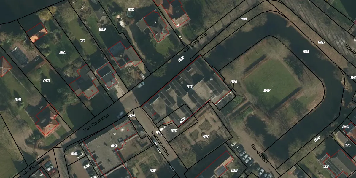 Het perceel waarop Kasteelseplaats 24 staat heeft een oppervlakte van 960 m². Dit is een groot perceel. De perceeloppervlakte wordt geregistreerd door het Kadaster. Gedetailleerde informatie over de maten van dit perceel kunt u vinden in het rapport Kadastrale kaart met maatvoering van Kasteelseplaats 24.