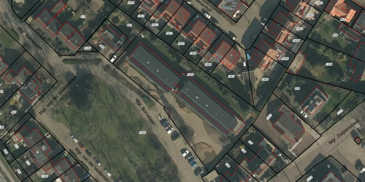 Het perceel waarop Mgr. Borretlaan 23 staat heeft een oppervlakte van 2572 m². Dit is een zeer groot perceel. De perceeloppervlakte wordt geregistreerd door het Kadaster. Gedetailleerde informatie over de maten van dit perceel kunt u vinden in het rapport Kadastrale kaart met maatvoering van Mgr. Borretlaan 23.