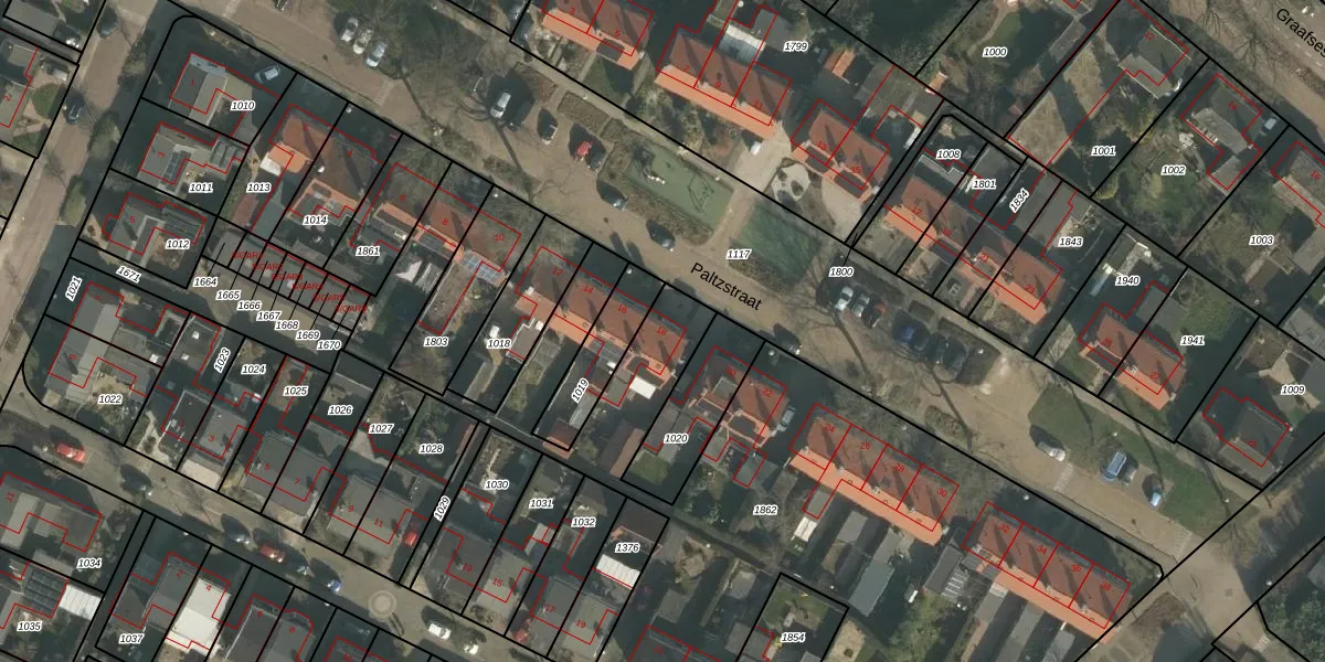 Het perceel waarop Paltzstraat 18 staat heeft een oppervlakte van 3894 m². Dit is een zeer groot perceel. De perceeloppervlakte wordt geregistreerd door het Kadaster. Gedetailleerde informatie over de maten van dit perceel kunt u vinden in het rapport Kadastrale kaart met maatvoering van Paltzstraat 18.