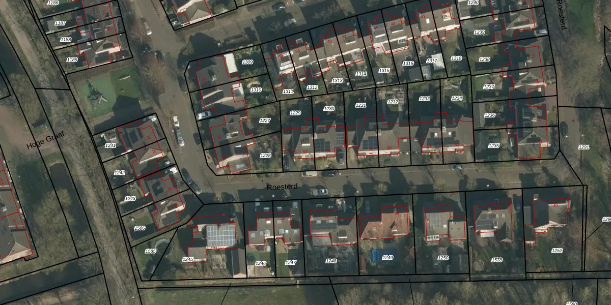 Het perceel waarop Roesterd 53 staat heeft een oppervlakte van 251 m². Dit is een middelgroot perceel. De perceeloppervlakte wordt geregistreerd door het Kadaster. Gedetailleerde informatie over de maten van dit perceel kunt u vinden in het rapport Kadastrale kaart met maatvoering van Roesterd 53.