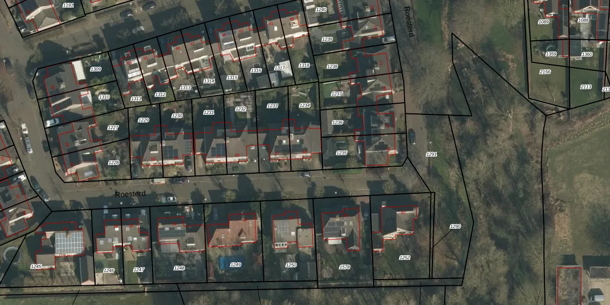 Het perceel waarop Roesterd 63 staat heeft een oppervlakte van 294 m². Dit is een middelgroot perceel. De perceeloppervlakte wordt geregistreerd door het Kadaster. Gedetailleerde informatie over de maten van dit perceel kunt u vinden in het rapport Kadastrale kaart met maatvoering van Roesterd 63.