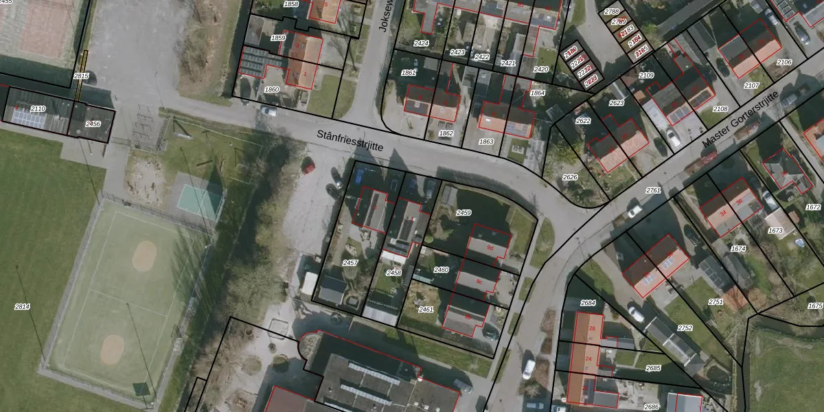 Stânfriesstrjitte 1 is gelegen op kadastraal perceel RDH00A2458. Deze kadastrale aanduiding is uniek en wordt gebruikt door het Kadaster om eigendomsrechten en andere zakelijke rechten vast te leggen. Het perceel maakt onderdeel uit van de kadastrale gemeente Roordahuizum.