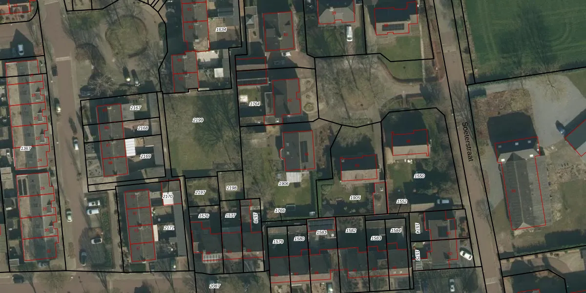 Het perceel waarop Soeterstraat 44 staat heeft een oppervlakte van 916 m². Dit is een groot perceel. De perceeloppervlakte wordt geregistreerd door het Kadaster. Gedetailleerde informatie over de maten van dit perceel kunt u vinden in het rapport Kadastrale kaart met maatvoering van Soeterstraat 44.