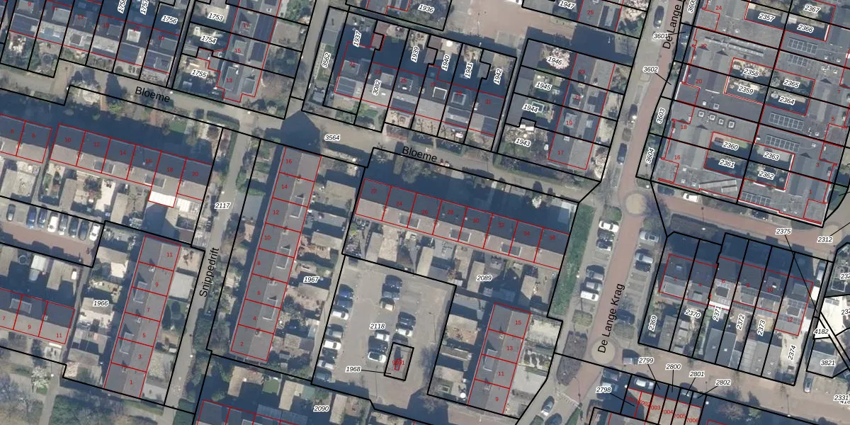 Het perceel waarop Bloeme 26 staat heeft een oppervlakte van 2015 m². Dit is een zeer groot perceel. De perceeloppervlakte wordt geregistreerd door het Kadaster. Gedetailleerde informatie over de maten van dit perceel kunt u vinden in het rapport Kadastrale kaart met maatvoering van Bloeme 26.