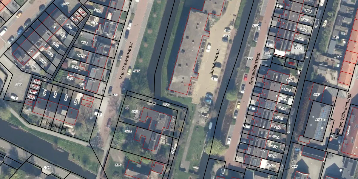 Het perceel waarop Bunchestraat 1 staat heeft een oppervlakte van 5005 m². Dit is een zeer groot perceel. De perceeloppervlakte wordt geregistreerd door het Kadaster. Gedetailleerde informatie over de maten van dit perceel kunt u vinden in het rapport Kadastrale kaart met maatvoering van Bunchestraat 1.