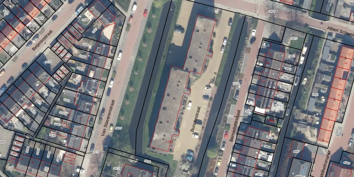 Het perceel waarop Bunchestraat 18 staat heeft een oppervlakte van 5005 m². Dit is een zeer groot perceel. De perceeloppervlakte wordt geregistreerd door het Kadaster. Gedetailleerde informatie over de maten van dit perceel kunt u vinden in het rapport Kadastrale kaart met maatvoering van Bunchestraat 18.