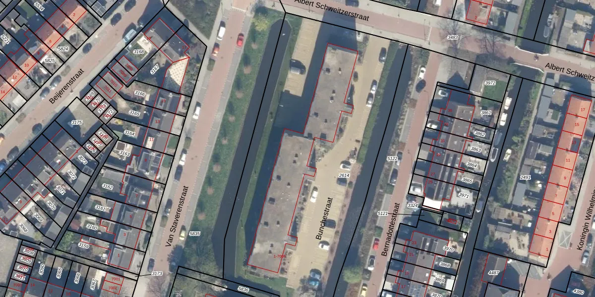 Het perceel waarop Bunchestraat 21 staat heeft een oppervlakte van 5005 m². Dit is een zeer groot perceel. De perceeloppervlakte wordt geregistreerd door het Kadaster. Gedetailleerde informatie over de maten van dit perceel kunt u vinden in het rapport Kadastrale kaart met maatvoering van Bunchestraat 21.
