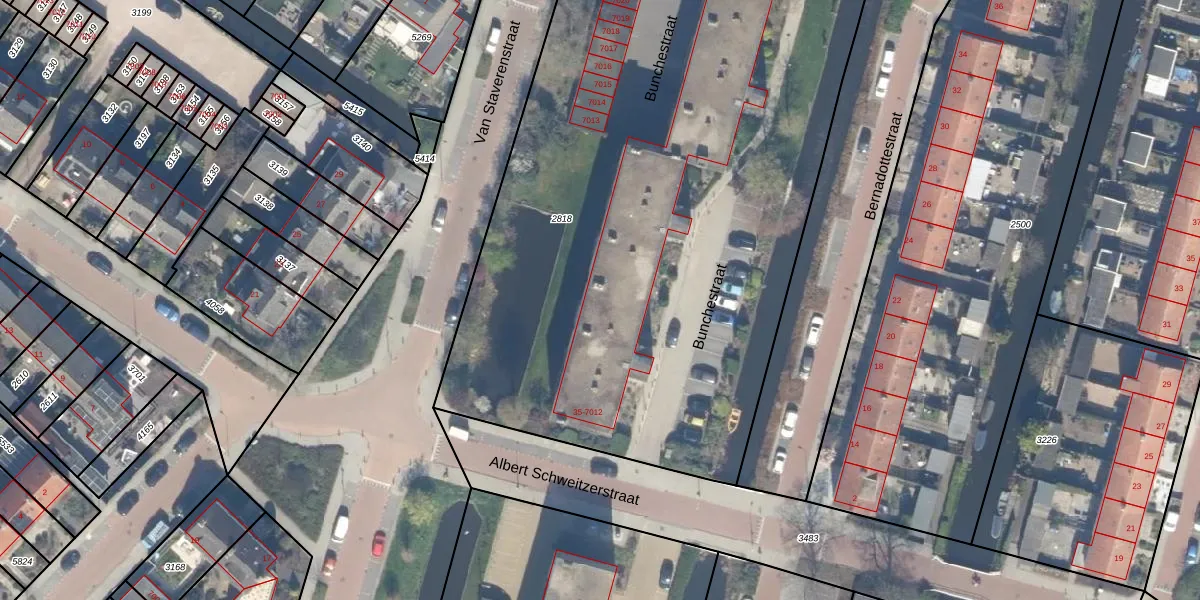 Het perceel waarop Bunchestraat 45 staat heeft een oppervlakte van 4686 m². Dit is een zeer groot perceel. De perceeloppervlakte wordt geregistreerd door het Kadaster. Gedetailleerde informatie over de maten van dit perceel kunt u vinden in het rapport Kadastrale kaart met maatvoering van Bunchestraat 45.
