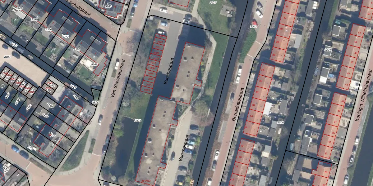 Het perceel waarop Bunchestraat 57 staat heeft een oppervlakte van 4686 m². Dit is een zeer groot perceel. De perceeloppervlakte wordt geregistreerd door het Kadaster. Gedetailleerde informatie over de maten van dit perceel kunt u vinden in het rapport Kadastrale kaart met maatvoering van Bunchestraat 57.