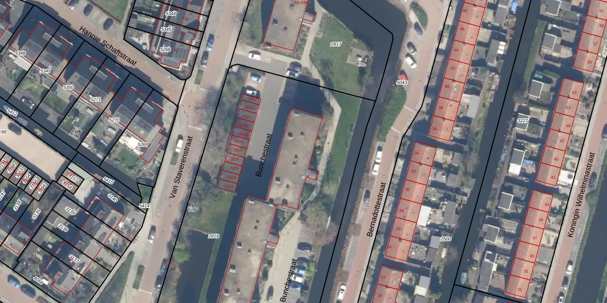 Het perceel waarop Bunchestraat 63 staat heeft een oppervlakte van 4686 m². Dit is een zeer groot perceel. De perceeloppervlakte wordt geregistreerd door het Kadaster. Gedetailleerde informatie over de maten van dit perceel kunt u vinden in het rapport Kadastrale kaart met maatvoering van Bunchestraat 63.