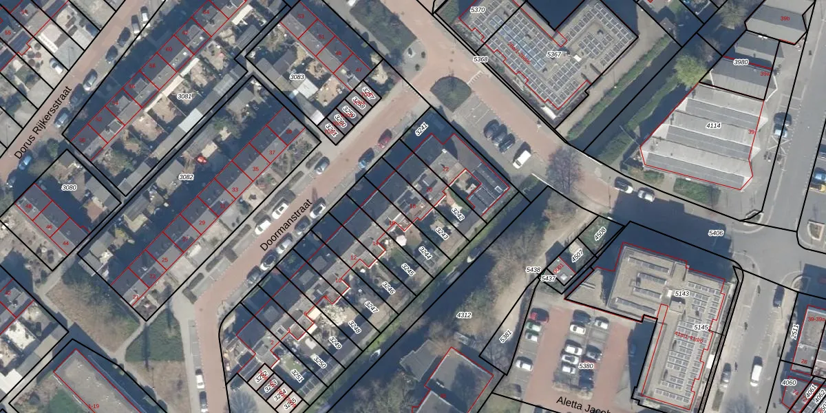 Het perceel waarop Doormanstraat 18 staat heeft een oppervlakte van 181 m². Dit is een middelgroot perceel. De perceeloppervlakte wordt geregistreerd door het Kadaster. Gedetailleerde informatie over de maten van dit perceel kunt u vinden in het rapport Kadastrale kaart met maatvoering van Doormanstraat 18.
