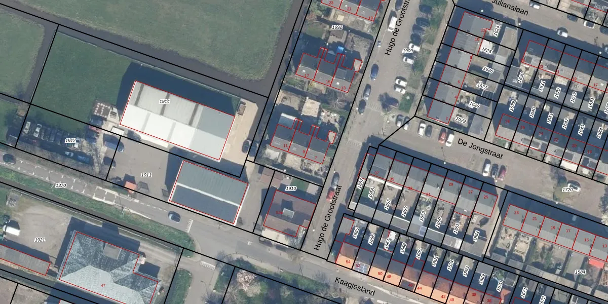 Het perceel waarop Hugo de Grootstraat 9 staat heeft een oppervlakte van 2495 m². Dit is een zeer groot perceel. De perceeloppervlakte wordt geregistreerd door het Kadaster. Gedetailleerde informatie over de maten van dit perceel kunt u vinden in het rapport Kadastrale kaart met maatvoering van Hugo de Grootstraat 9.