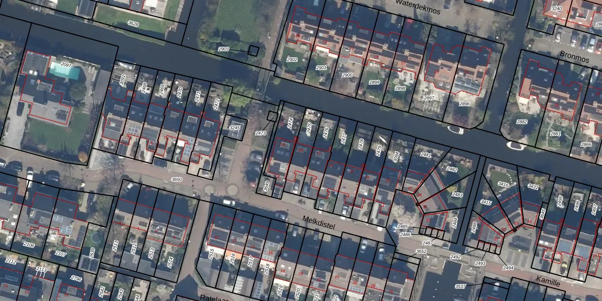 Melkdistel 15 is gelegen op kadastraal perceel RWK02C2475. Deze kadastrale aanduiding is uniek en wordt gebruikt door het Kadaster om eigendomsrechten en andere zakelijke rechten vast te leggen. Het perceel maakt onderdeel uit van de kadastrale gemeente Reeuwijk.