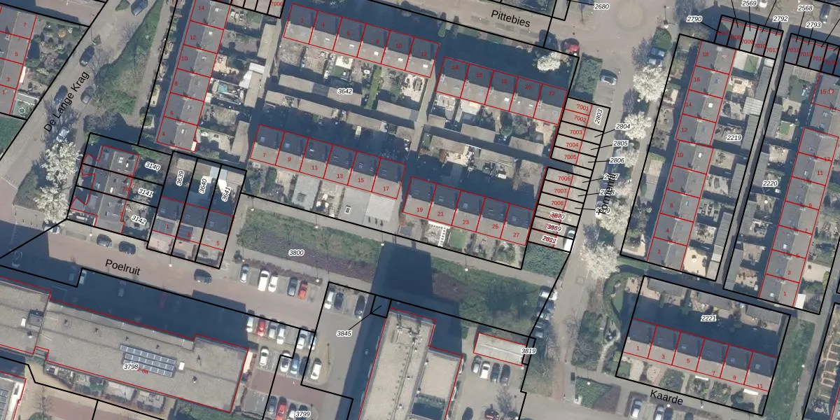 Het perceel waarop Poelruit 19 staat heeft een oppervlakte van 4693 m². Dit is een zeer groot perceel. De perceeloppervlakte wordt geregistreerd door het Kadaster. Gedetailleerde informatie over de maten van dit perceel kunt u vinden in het rapport Kadastrale kaart met maatvoering van Poelruit 19.