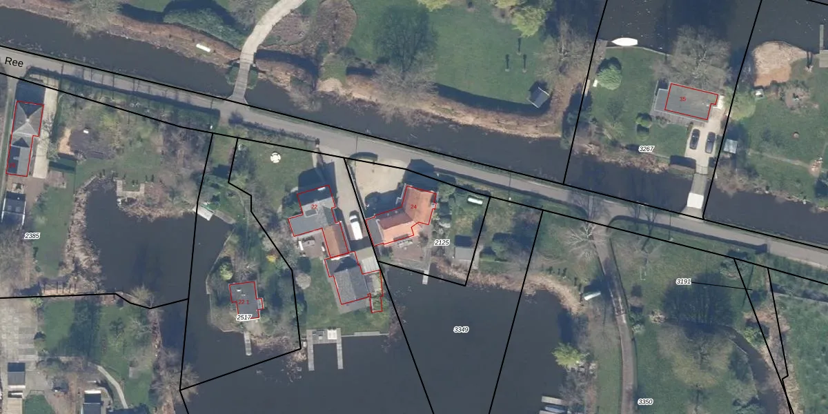 Ree 24 is gelegen op kadastraal perceel RWK02G2125. Deze kadastrale aanduiding is uniek en wordt gebruikt door het Kadaster om eigendomsrechten en andere zakelijke rechten vast te leggen. Het perceel maakt onderdeel uit van de kadastrale gemeente Reeuwijk.
