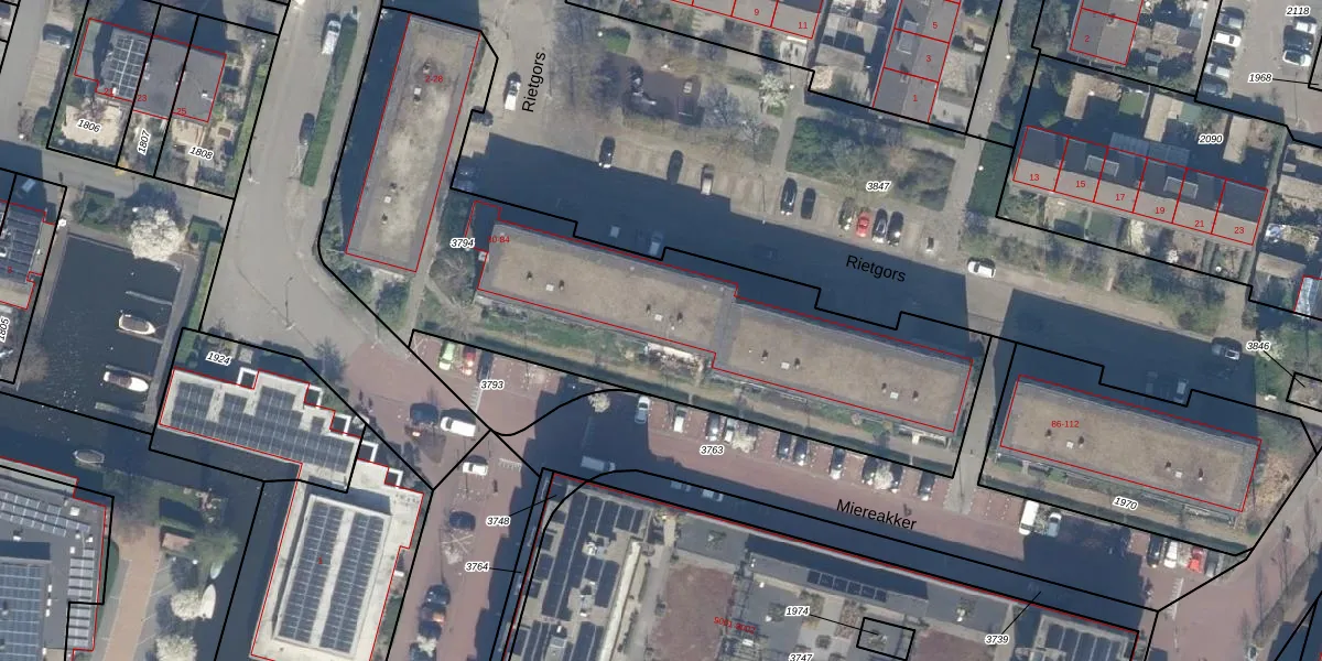 Het perceel waarop Rietgors 56 staat heeft een oppervlakte van 2588 m². Dit is een zeer groot perceel. De perceeloppervlakte wordt geregistreerd door het Kadaster. Gedetailleerde informatie over de maten van dit perceel kunt u vinden in het rapport Kadastrale kaart met maatvoering van Rietgors 56.