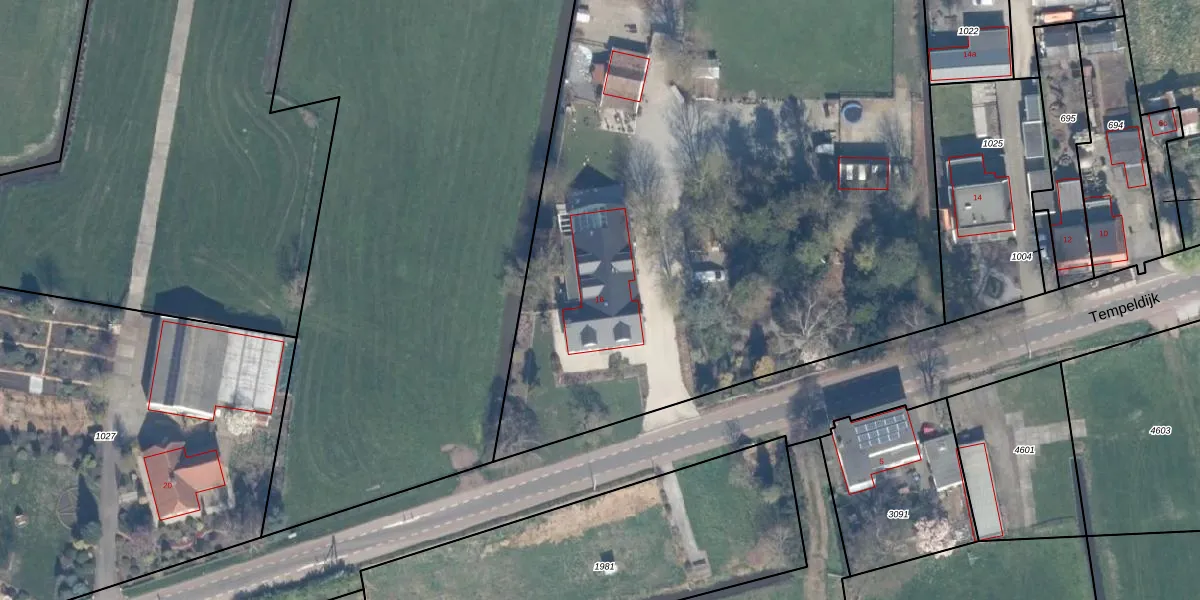 Het perceel waarop Tempeldijk 16 staat heeft een oppervlakte van 1,0 ha. Dit is een zeer groot perceel. De perceeloppervlakte wordt geregistreerd door het Kadaster. Gedetailleerde informatie over de maten van dit perceel kunt u vinden in het rapport Kadastrale kaart met maatvoering van Tempeldijk 16.