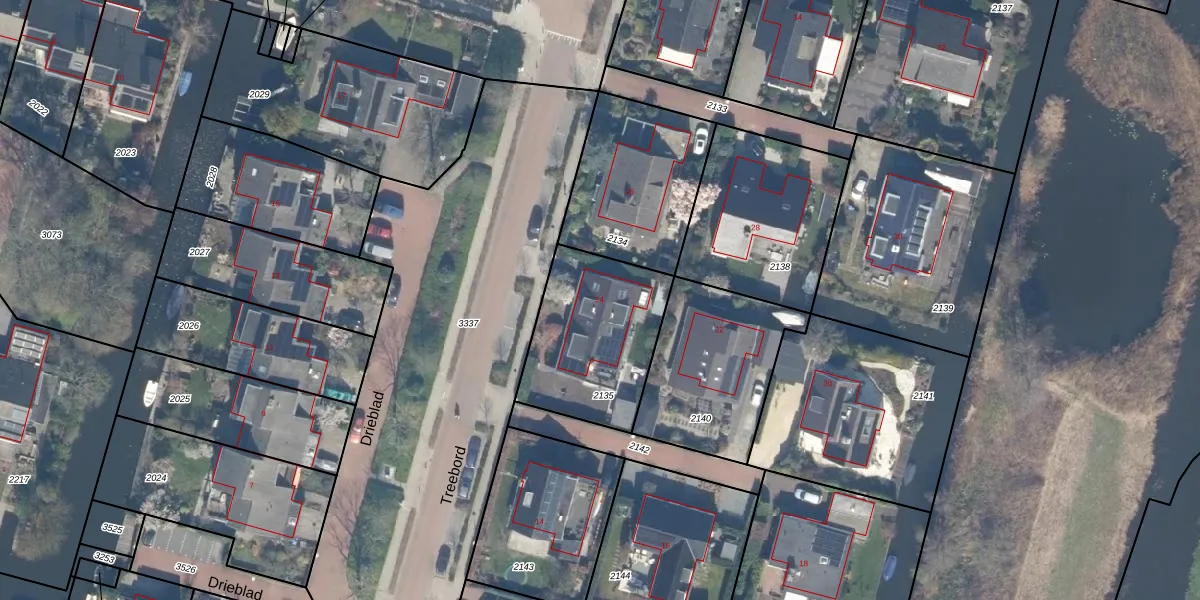 Het perceel waarop Treebord 24 staat heeft een oppervlakte van 545 m². Dit is een groot perceel. De perceeloppervlakte wordt geregistreerd door het Kadaster. Gedetailleerde informatie over de maten van dit perceel kunt u vinden in het rapport Kadastrale kaart met maatvoering van Treebord 24.