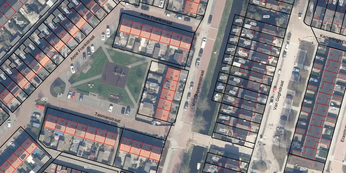 Het perceel waarop Van Staverenstraat 57 staat heeft een oppervlakte van 704 m². Dit is een groot perceel. De perceeloppervlakte wordt geregistreerd door het Kadaster. Gedetailleerde informatie over de maten van dit perceel kunt u vinden in het rapport Kadastrale kaart met maatvoering van Van Staverenstraat 57.