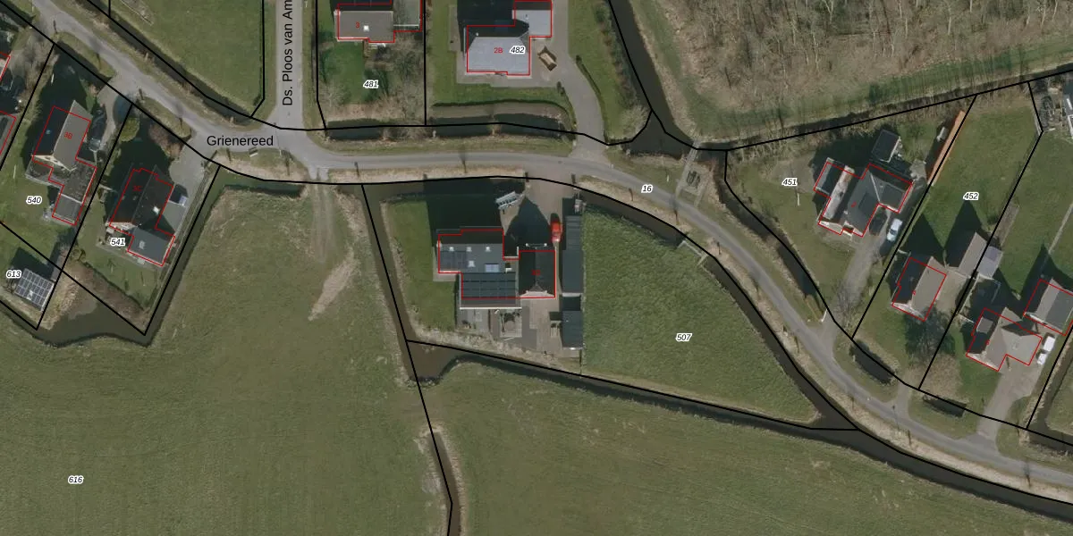 Het perceel waarop Grienereed 3-D staat heeft een oppervlakte van 2368 m². Dit is een zeer groot perceel. De perceeloppervlakte wordt geregistreerd door het Kadaster. Gedetailleerde informatie over de maten van dit perceel kunt u vinden in het rapport Kadastrale kaart met maatvoering van Grienereed 3-D.