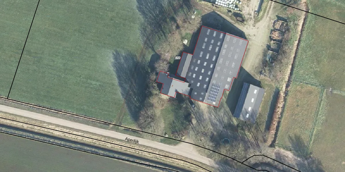 Het perceel waarop Apedijk 7 staat heeft een oppervlakte van 1,9 ha. Dit is een zeer groot perceel. De perceeloppervlakte wordt geregistreerd door het Kadaster. Gedetailleerde informatie over de maten van dit perceel kunt u vinden in het rapport Kadastrale kaart met maatvoering van Apedijk 7.