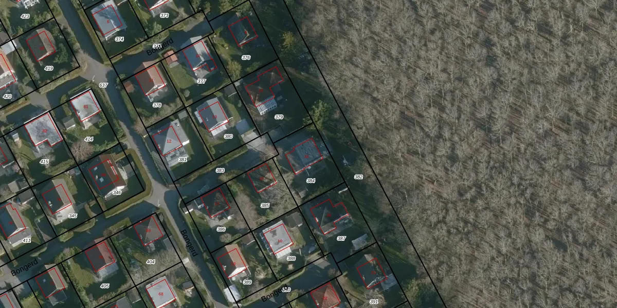 Het perceel waarop Bongerd 15 staat heeft een oppervlakte van 365 m². Dit is een groot perceel. De perceeloppervlakte wordt geregistreerd door het Kadaster. Gedetailleerde informatie over de maten van dit perceel kunt u vinden in het rapport Kadastrale kaart met maatvoering van Bongerd 15.