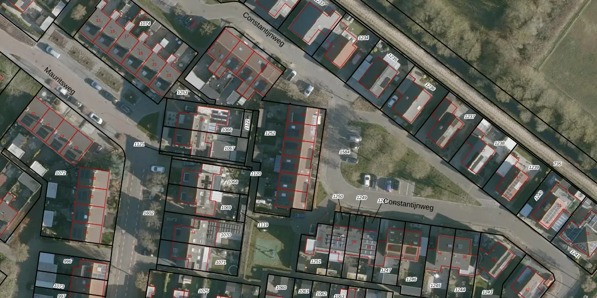 Het perceel waarop Constantijnweg 14 staat heeft een oppervlakte van 1318 m². Dit is een zeer groot perceel. De perceeloppervlakte wordt geregistreerd door het Kadaster. Gedetailleerde informatie over de maten van dit perceel kunt u vinden in het rapport Kadastrale kaart met maatvoering van Constantijnweg 14.