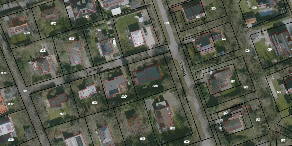 Het perceel waarop Eikenmeet 5 staat heeft een oppervlakte van 657 m². Dit is een groot perceel. De perceeloppervlakte wordt geregistreerd door het Kadaster. Gedetailleerde informatie over de maten van dit perceel kunt u vinden in het rapport Kadastrale kaart met maatvoering van Eikenmeet 5.