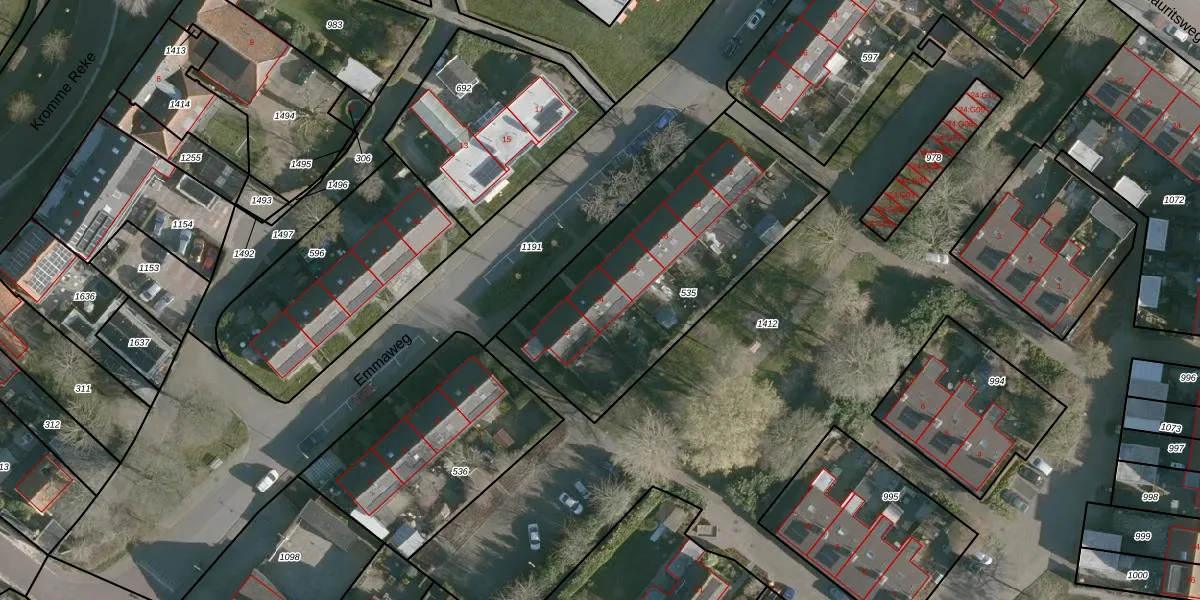 Het perceel waarop Emmaweg 14 staat heeft een oppervlakte van 1185 m². Dit is een zeer groot perceel. De perceeloppervlakte wordt geregistreerd door het Kadaster. Gedetailleerde informatie over de maten van dit perceel kunt u vinden in het rapport Kadastrale kaart met maatvoering van Emmaweg 14.
