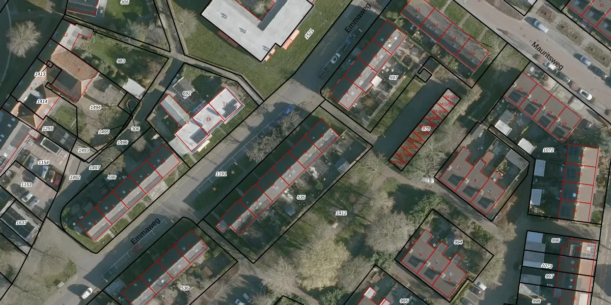 Het perceel waarop Emmaweg 20 staat heeft een oppervlakte van 1185 m². Dit is een zeer groot perceel. De perceeloppervlakte wordt geregistreerd door het Kadaster. Gedetailleerde informatie over de maten van dit perceel kunt u vinden in het rapport Kadastrale kaart met maatvoering van Emmaweg 20.