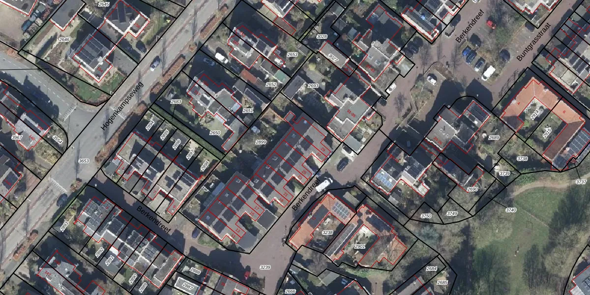 Het perceel waarop Berkendreef 27 staat heeft een oppervlakte van 1445 m². Dit is een zeer groot perceel. De perceeloppervlakte wordt geregistreerd door het Kadaster. Gedetailleerde informatie over de maten van dit perceel kunt u vinden in het rapport Kadastrale kaart met maatvoering van Berkendreef 27.