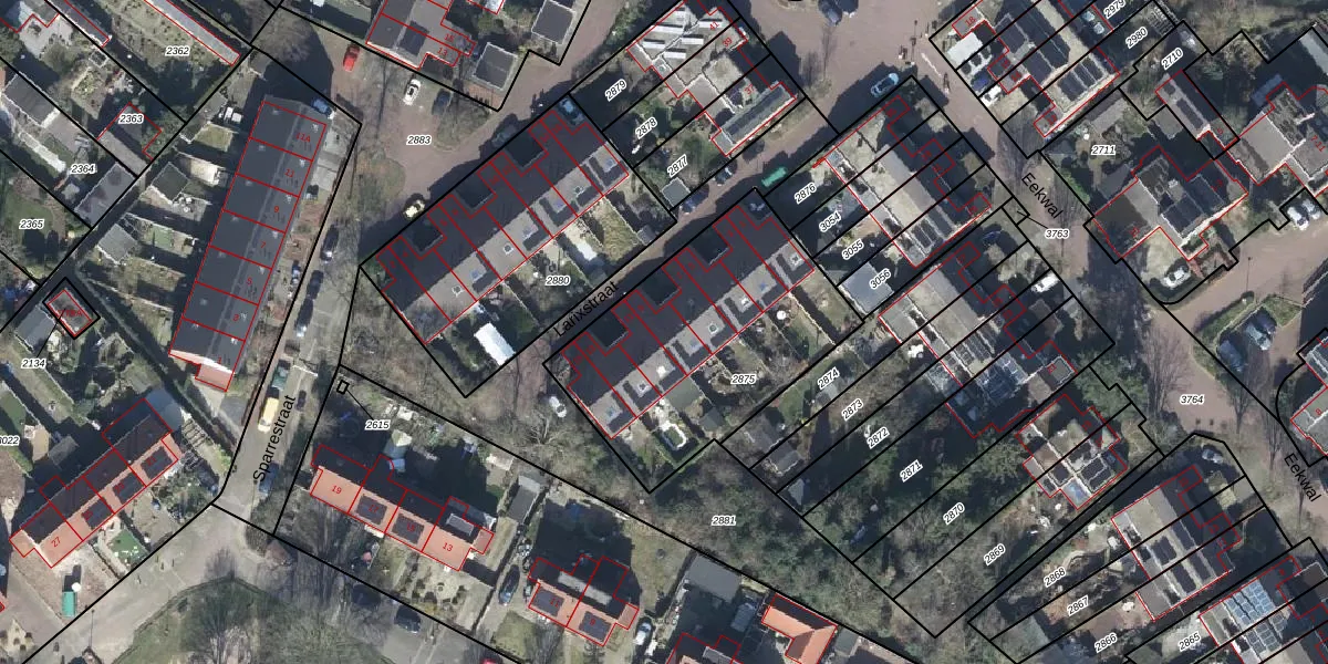 Larixstraat 9 is gelegen op kadastraal perceel RKM00B2875. Deze kadastrale aanduiding is uniek en wordt gebruikt door het Kadaster om eigendomsrechten en andere zakelijke rechten vast te leggen. Het perceel maakt onderdeel uit van de kadastrale gemeente Renkum.