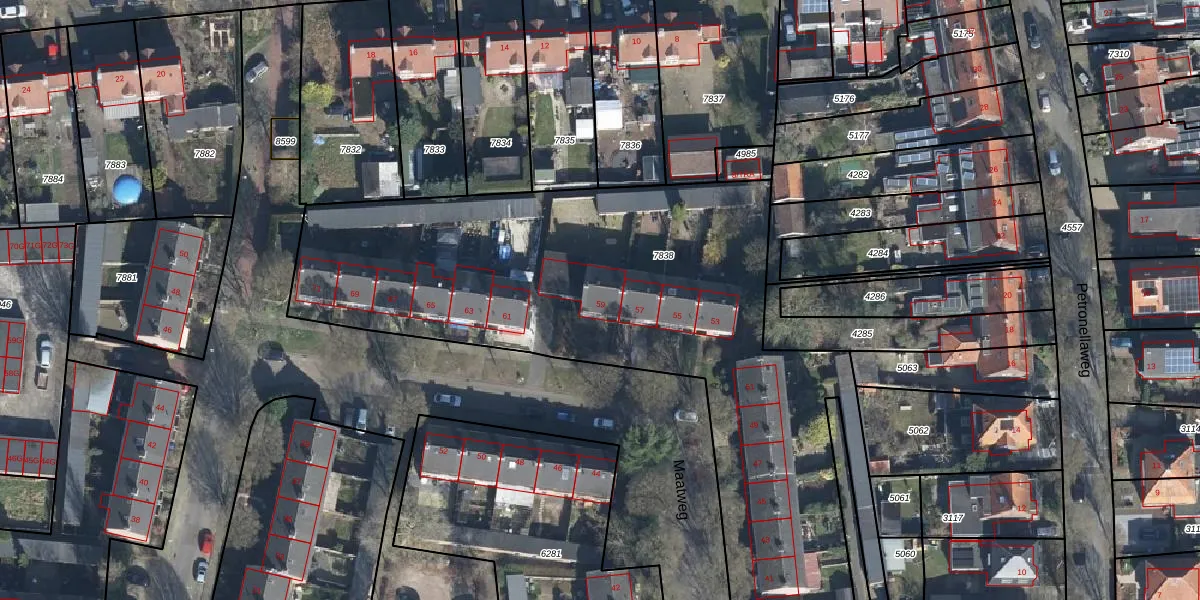 Het perceel waarop Maatweg 59 staat heeft een oppervlakte van 3125 m². Dit is een zeer groot perceel. De perceeloppervlakte wordt geregistreerd door het Kadaster. Gedetailleerde informatie over de maten van dit perceel kunt u vinden in het rapport Kadastrale kaart met maatvoering van Maatweg 59.