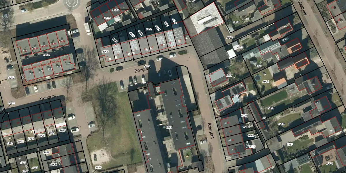 Het perceel waarop Boegent 36 staat heeft een oppervlakte van 1789 m². Dit is een zeer groot perceel. De perceeloppervlakte wordt geregistreerd door het Kadaster. Gedetailleerde informatie over de maten van dit perceel kunt u vinden in het rapport Kadastrale kaart met maatvoering van Boegent 36.
