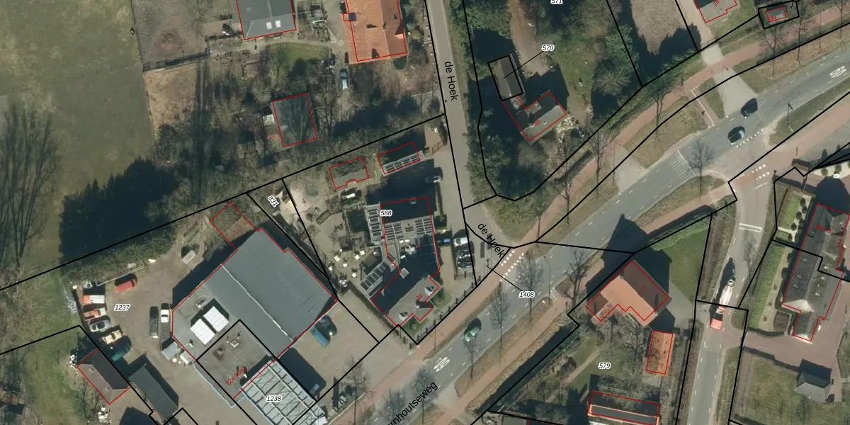 Het perceel waarop de Hoek 3 staat heeft een oppervlakte van 1540 m². Dit is een zeer groot perceel. De perceeloppervlakte wordt geregistreerd door het Kadaster. Gedetailleerde informatie over de maten van dit perceel kunt u vinden in het rapport Kadastrale kaart met maatvoering van de Hoek 3.