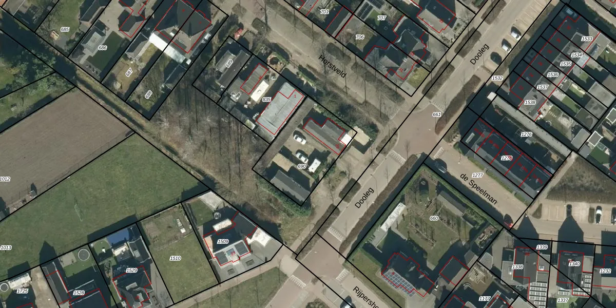 Het perceel waarop Dooleg 27 staat heeft een oppervlakte van 603 m². Dit is een groot perceel. De perceeloppervlakte wordt geregistreerd door het Kadaster. Gedetailleerde informatie over de maten van dit perceel kunt u vinden in het rapport Kadastrale kaart met maatvoering van Dooleg 27.