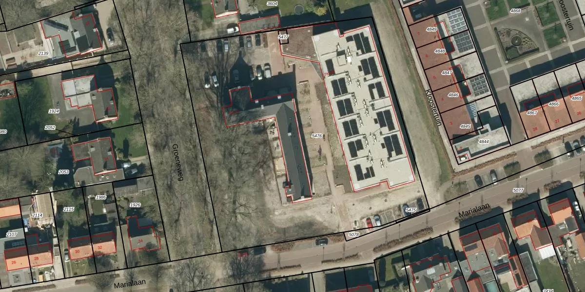 Het perceel waarop Groeneweg 7-G staat heeft een oppervlakte van 4957 m². Dit is een zeer groot perceel. De perceeloppervlakte wordt geregistreerd door het Kadaster. Gedetailleerde informatie over de maten van dit perceel kunt u vinden in het rapport Kadastrale kaart met maatvoering van Groeneweg 7-G.
