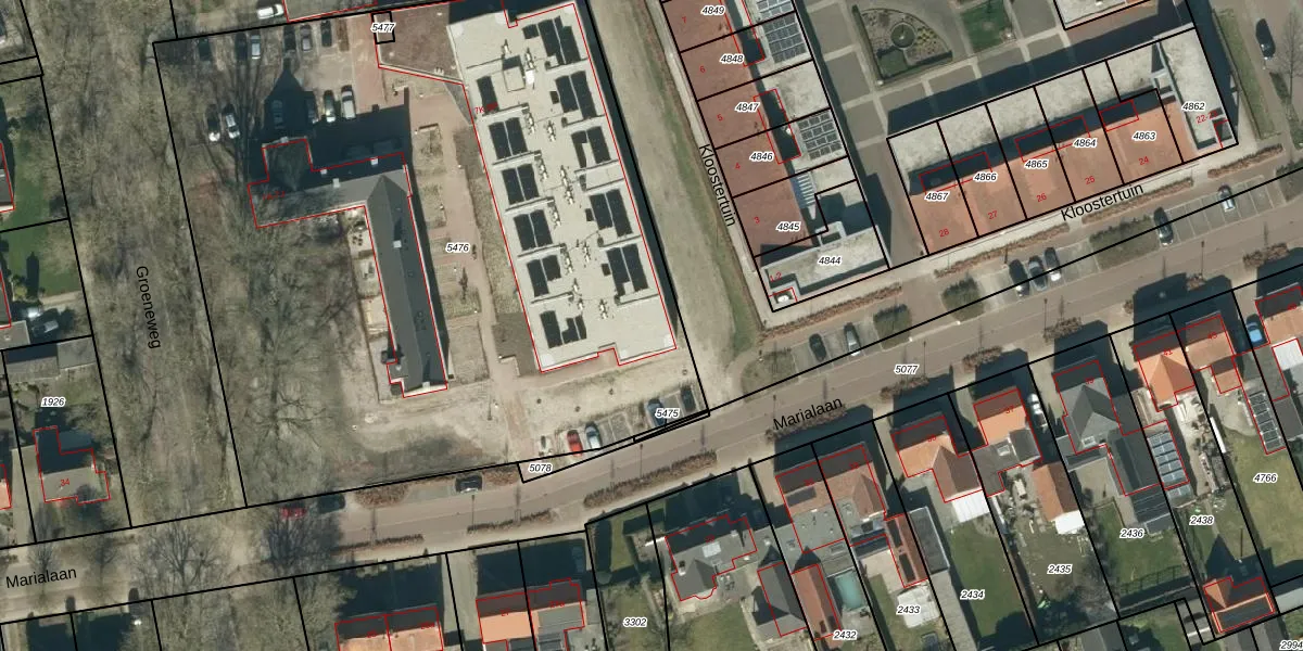 Het perceel waarop Groeneweg 7-T staat heeft een oppervlakte van 4957 m². Dit is een zeer groot perceel. De perceeloppervlakte wordt geregistreerd door het Kadaster. Gedetailleerde informatie over de maten van dit perceel kunt u vinden in het rapport Kadastrale kaart met maatvoering van Groeneweg 7-T.