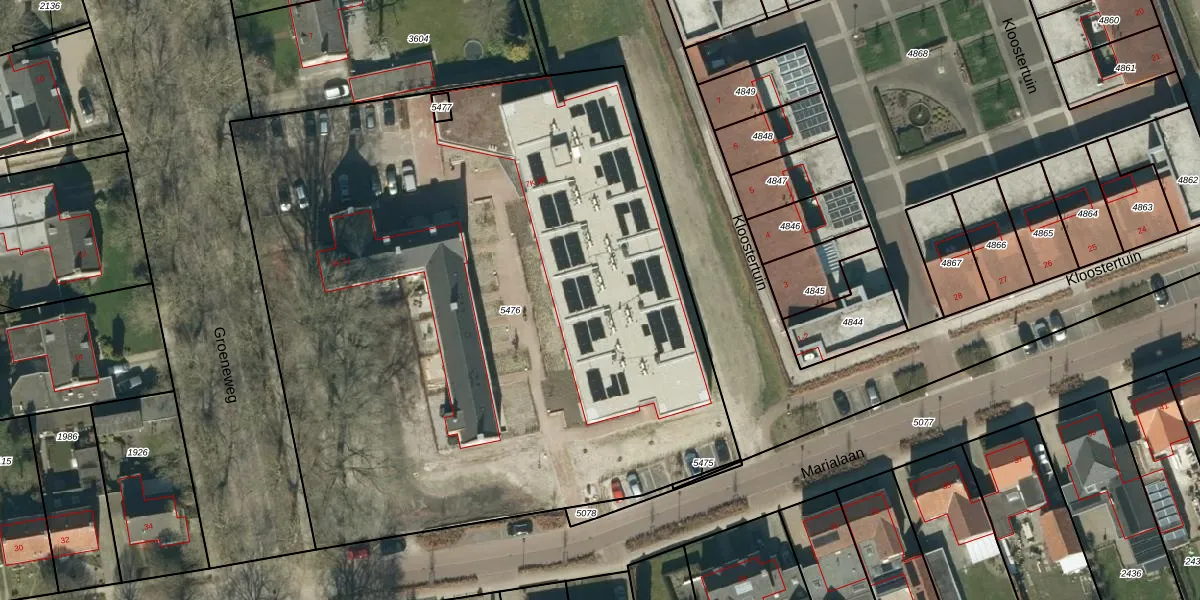 Het perceel waarop Groeneweg 9-M staat heeft een oppervlakte van 4957 m². Dit is een zeer groot perceel. De perceeloppervlakte wordt geregistreerd door het Kadaster. Gedetailleerde informatie over de maten van dit perceel kunt u vinden in het rapport Kadastrale kaart met maatvoering van Groeneweg 9-M.