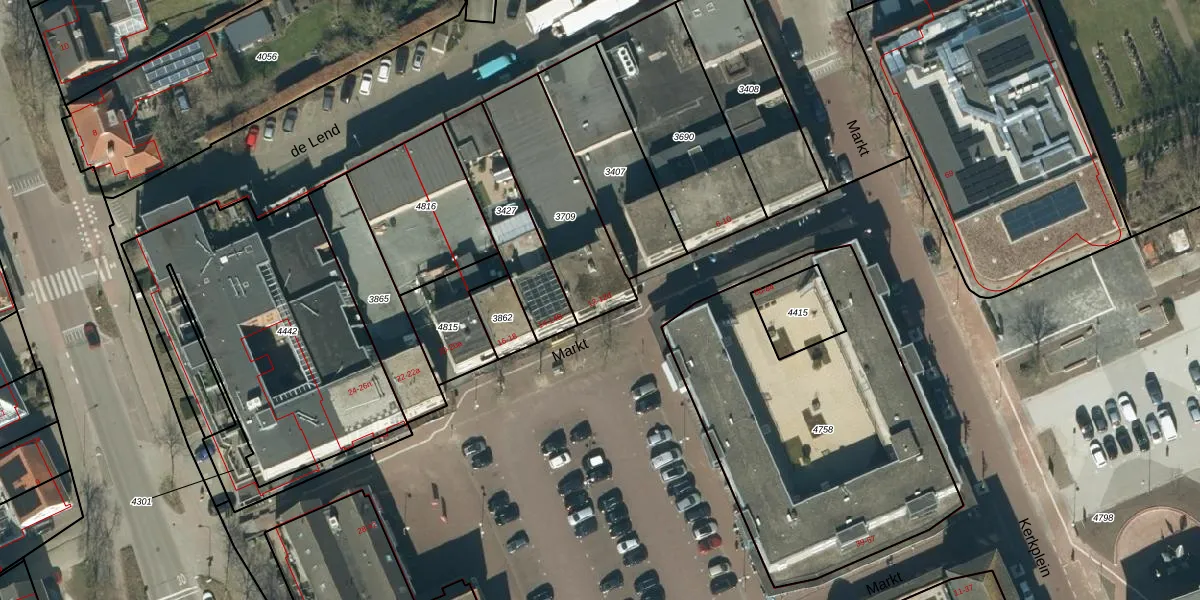 Het perceel waarop Markt 12 staat heeft een oppervlakte van 438 m². Dit is een groot perceel. De perceeloppervlakte wordt geregistreerd door het Kadaster. Gedetailleerde informatie over de maten van dit perceel kunt u vinden in het rapport Kadastrale kaart met maatvoering van Markt 12.