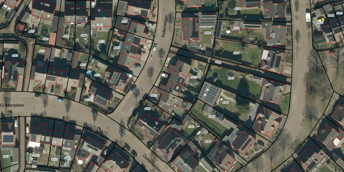 Het perceel waarop Pollenekker 19 staat heeft een oppervlakte van 598 m². Dit is een groot perceel. De perceeloppervlakte wordt geregistreerd door het Kadaster. Gedetailleerde informatie over de maten van dit perceel kunt u vinden in het rapport Kadastrale kaart met maatvoering van Pollenekker 19.