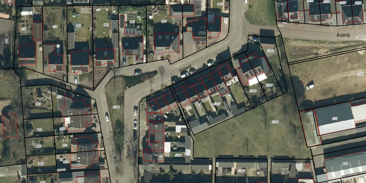 Het perceel waarop Smeel 35 staat heeft een oppervlakte van 1042 m². Dit is een zeer groot perceel. De perceeloppervlakte wordt geregistreerd door het Kadaster. Gedetailleerde informatie over de maten van dit perceel kunt u vinden in het rapport Kadastrale kaart met maatvoering van Smeel 35.