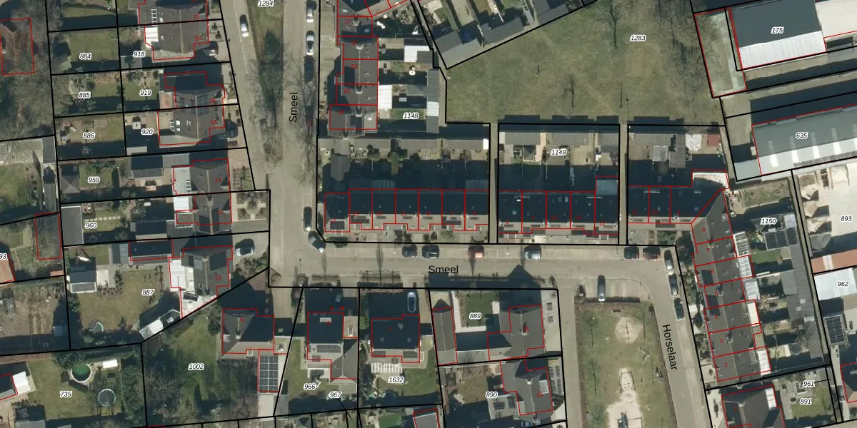 Het perceel waarop Smeel 9 staat heeft een oppervlakte van 2026 m². Dit is een zeer groot perceel. De perceeloppervlakte wordt geregistreerd door het Kadaster. Gedetailleerde informatie over de maten van dit perceel kunt u vinden in het rapport Kadastrale kaart met maatvoering van Smeel 9.