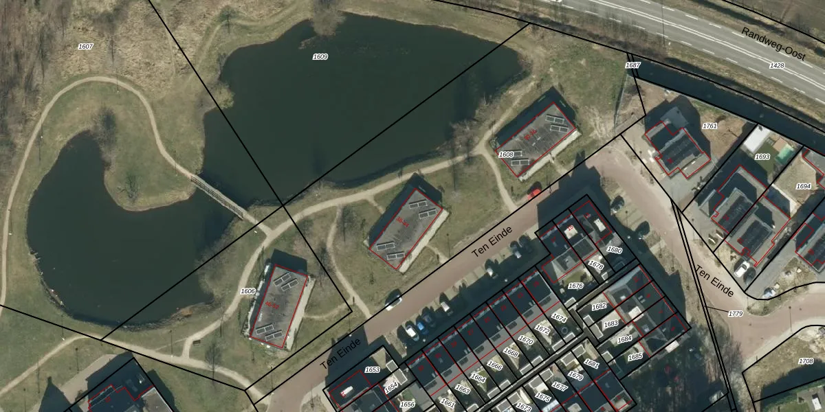 Het perceel waarop Ten Einde 44 staat heeft een oppervlakte van 3070 m². Dit is een zeer groot perceel. De perceeloppervlakte wordt geregistreerd door het Kadaster. Gedetailleerde informatie over de maten van dit perceel kunt u vinden in het rapport Kadastrale kaart met maatvoering van Ten Einde 44.