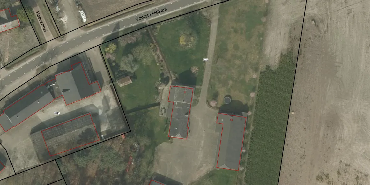 Het perceel waarop Voorste Heikant 5 staat heeft een oppervlakte van 1,7 ha. Dit is een zeer groot perceel. De perceeloppervlakte wordt geregistreerd door het Kadaster. Gedetailleerde informatie over de maten van dit perceel kunt u vinden in het rapport Kadastrale kaart met maatvoering van Voorste Heikant 5.
