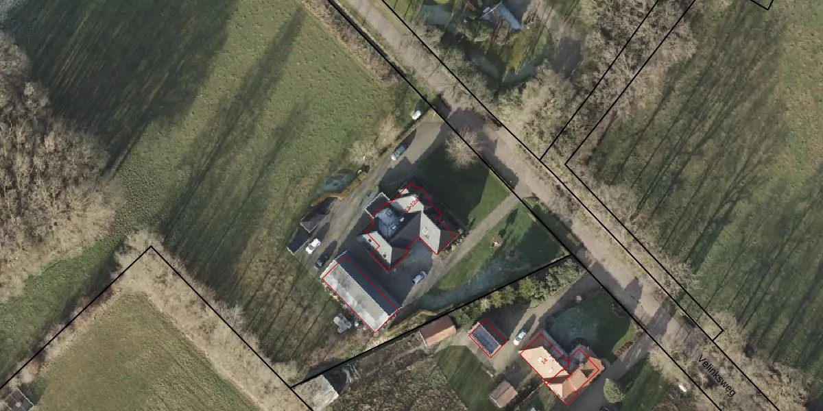 Het perceel waarop Velinksweg 12 staat heeft een oppervlakte van 2,5 ha. Dit is een zeer groot perceel. De perceeloppervlakte wordt geregistreerd door het Kadaster. Gedetailleerde informatie over de maten van dit perceel kunt u vinden in het rapport Kadastrale kaart met maatvoering van Velinksweg 12.