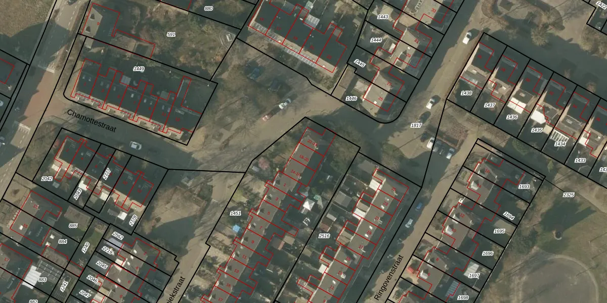 Het perceel waarop Chamottestraat 20 staat heeft een oppervlakte van 2055 m². Dit is een zeer groot perceel. De perceeloppervlakte wordt geregistreerd door het Kadaster. Gedetailleerde informatie over de maten van dit perceel kunt u vinden in het rapport Kadastrale kaart met maatvoering van Chamottestraat 20.