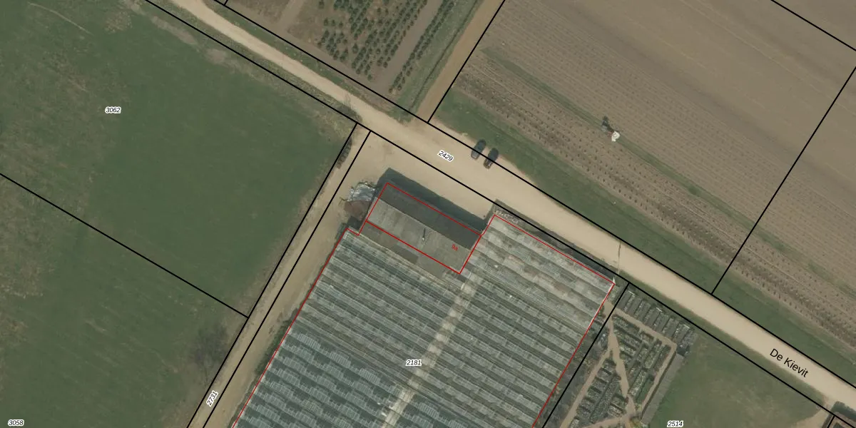 Het perceel waarop De Kievit 9-a staat heeft een oppervlakte van 5650 m². Dit is een zeer groot perceel. De perceeloppervlakte wordt geregistreerd door het Kadaster. Gedetailleerde informatie over de maten van dit perceel kunt u vinden in het rapport Kadastrale kaart met maatvoering van De Kievit 9-a.